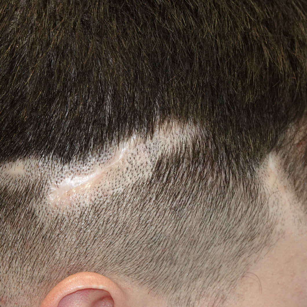 Die veraltete FUT-Methode („Streifenmethode"), die wir nicht durchführen, kann im Falle von Komplikationen zu ausgedehnten Narben führen. Auch anderen Operationen oder sonstige Traumata (z. B. Unfälle, Geburtsfehler oder Brandverletzungen) können ästhetisch unangenehme Narben auf der Kopfhaut hinterlassen. Reife Narben können mit der Haartransplantation nach der FUE-Methode vollständig verdeckt werden.